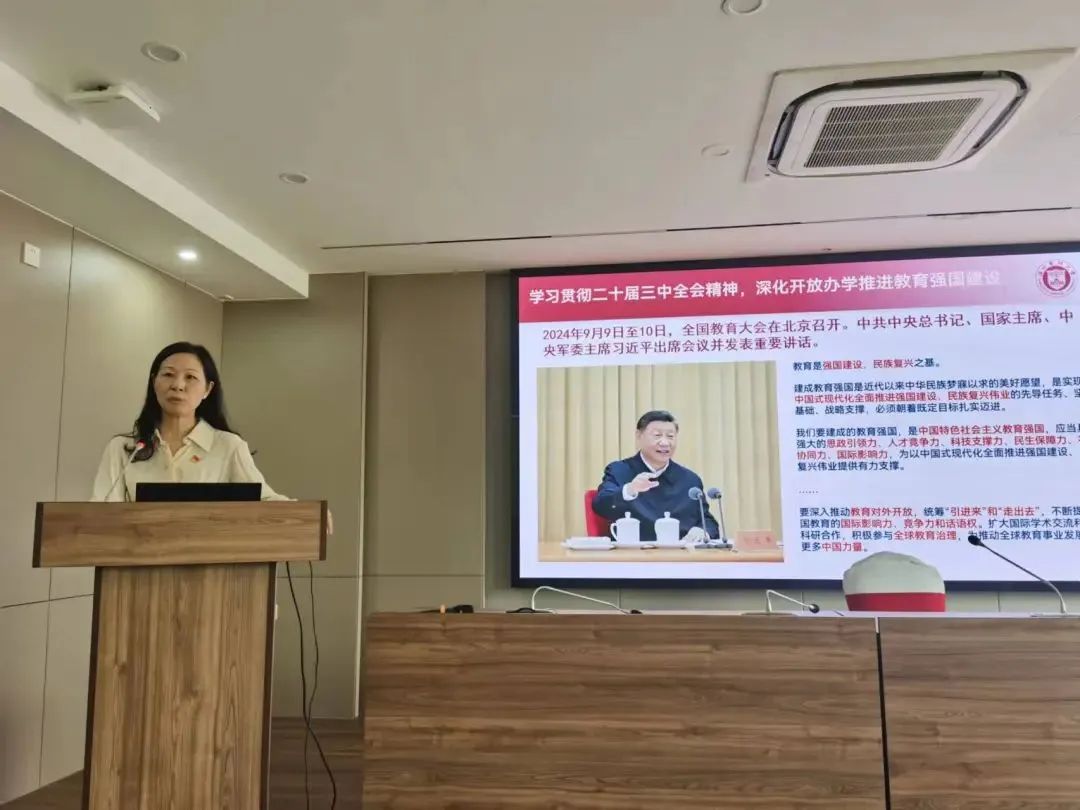 朱雪波以《学习贯彻党的二十届三中全会精神,深化开放办学推进教育强国建设》为题,对党的二十届三中全会精神进行了全面解读,并紧密结合学习贯彻全国教育大会精神,立足学校发展实际,就如何深入实施教育、科技、人才一体化改革、开拓教育对外开放新局面提出了具体思路和措施。