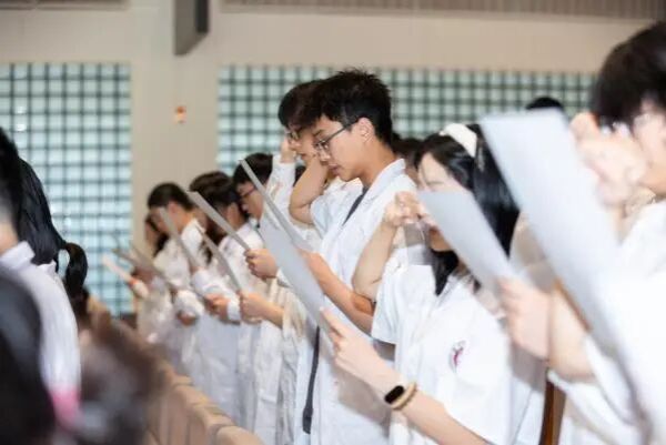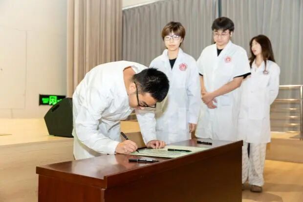 报告厅内瞬间沉静,领誓人罗恩哲手持誓词,以铿锵有力的声音带领全体2023级学子宣读英文版医学生誓言。每一句 “健康所系,性命相托” 的承诺,都似在叩击人心,凝聚着对医学事业的敬畏。随后,中加双方嘉宾依次上台,为即将步入临床阶段的同学们细致整理白大褂,并为他们郑重扣上第一颗纽扣——这枚小小的纽扣,不仅系住了医学生的专业与身份,更象征着医学责任与使命的接力传承。授袍结束后,同学们在誓词上郑重签下自己的名字,标志着这场医学“成人礼”圆满完成。笔墨落下的瞬间,既是对今日誓言的践行,更是对未来坚守医者初心、守护生命健康的坚定承诺。