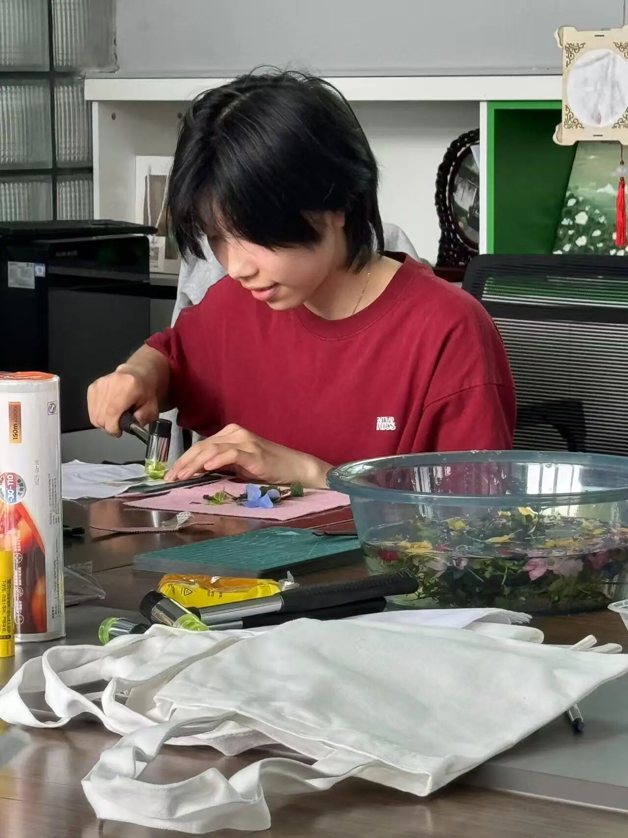 当叶脉纹理逐渐清晰在帆布袋/书签上,自然的诗意便有了具象形态~