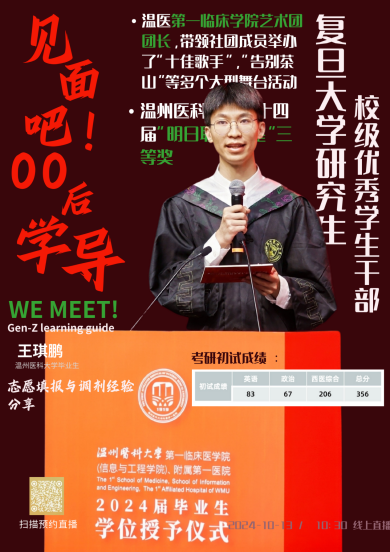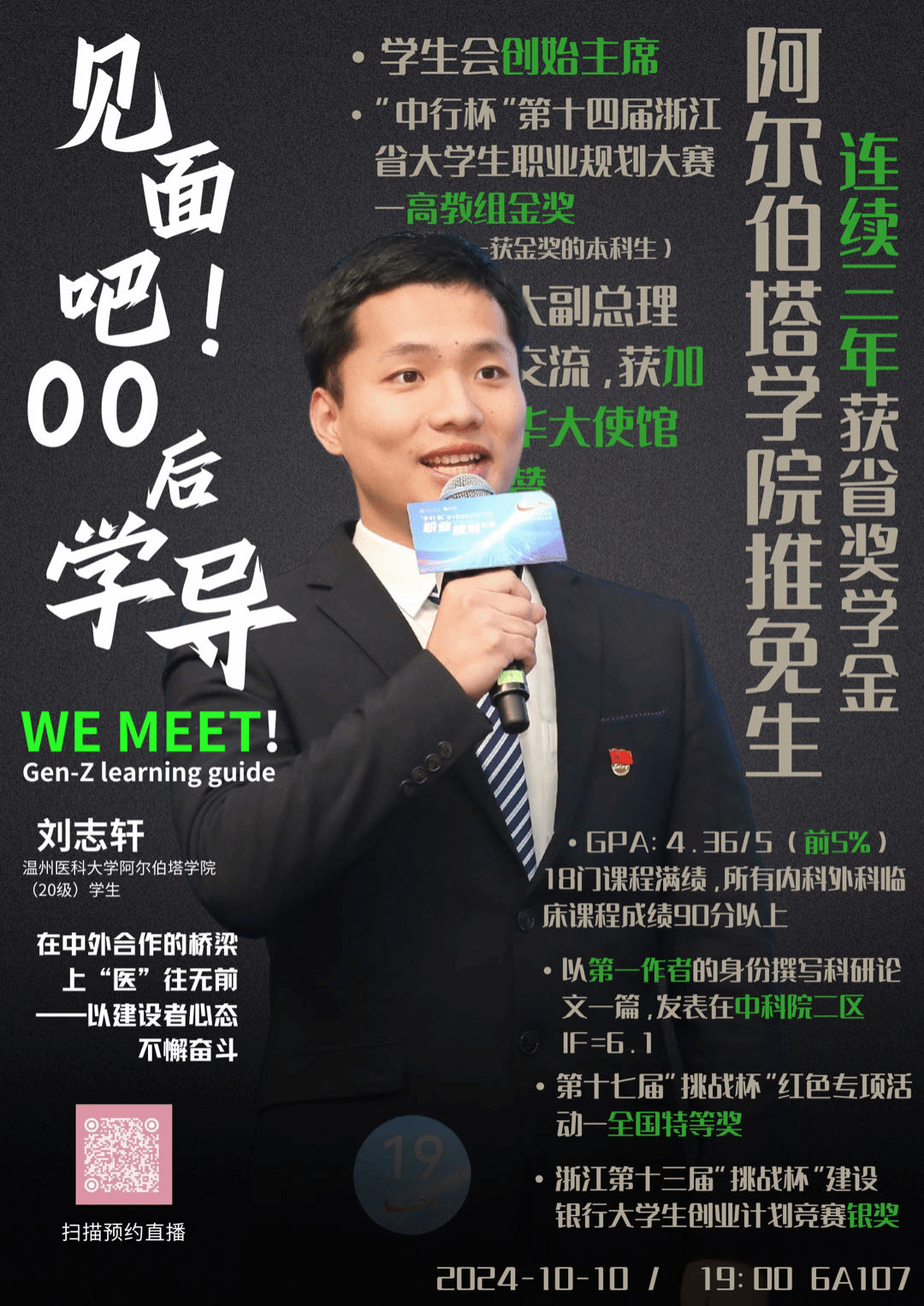 宣传部主导策划“见面吧!00后学导”品牌项目,累计举办24场专题讲座,覆盖全院本科生近300人次。项目特邀清华大学临床医学院考研录取者、浙江大学医学院保研获得者、雅思8.5分高分学员等15位优秀学子担任主讲,系统分享学术发展经验:每场讲座设置互动答疑环节,观看直播的同学可通过线上弹幕的方式进行提问,截至目前,线上收看人数和已突破5000人次,为阿院学子指点迷津,赋能成长。