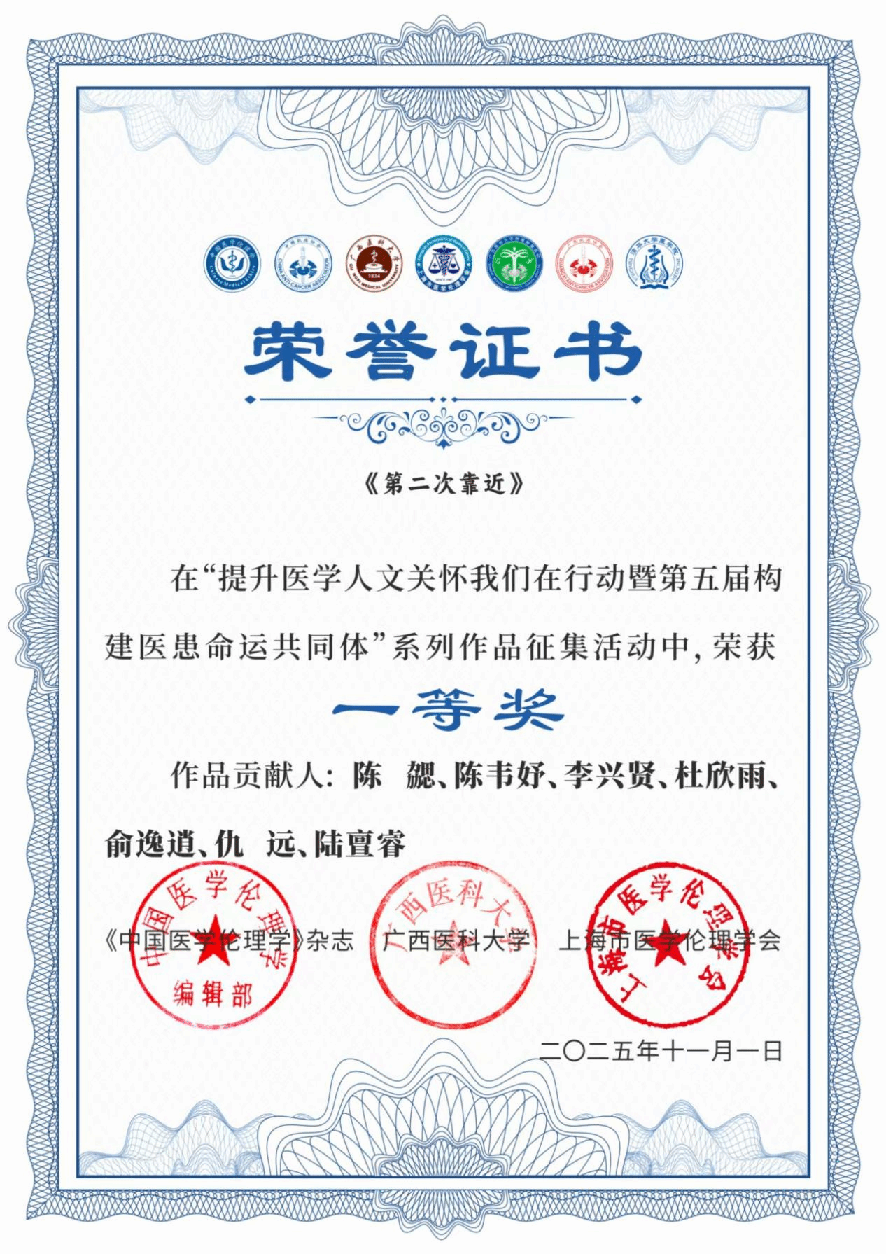 本事件后来被小组成员成人短视频 陈韦妤、杜欣雨、俞逸逍、李兴贤、仇远、陆亶睿及指导老师陈勰整理成医学叙事作品《第二次靠近》,并投稿至中国医学伦理学杂志“提升医学人文关怀我们在行动暨第五届构建医患命运共同体”征文活动叙事医学作品征集活动。