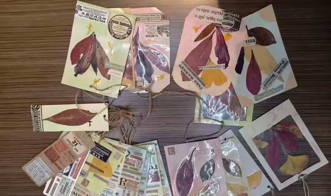 活动现场布置成温馨的“秋日展台”,银杏、梧桐落叶与干花等材料整齐摆放。在生活部成员的引导下,同学们精心修剪、拼贴、穿绳,将零落秋叶转化为一枚枚独具韵味的书签。过程中,大家互相协助、交流创意,赞叹声与欢笑此起彼伏,俨然成为一场秋日里的集体创作与心灵放松。