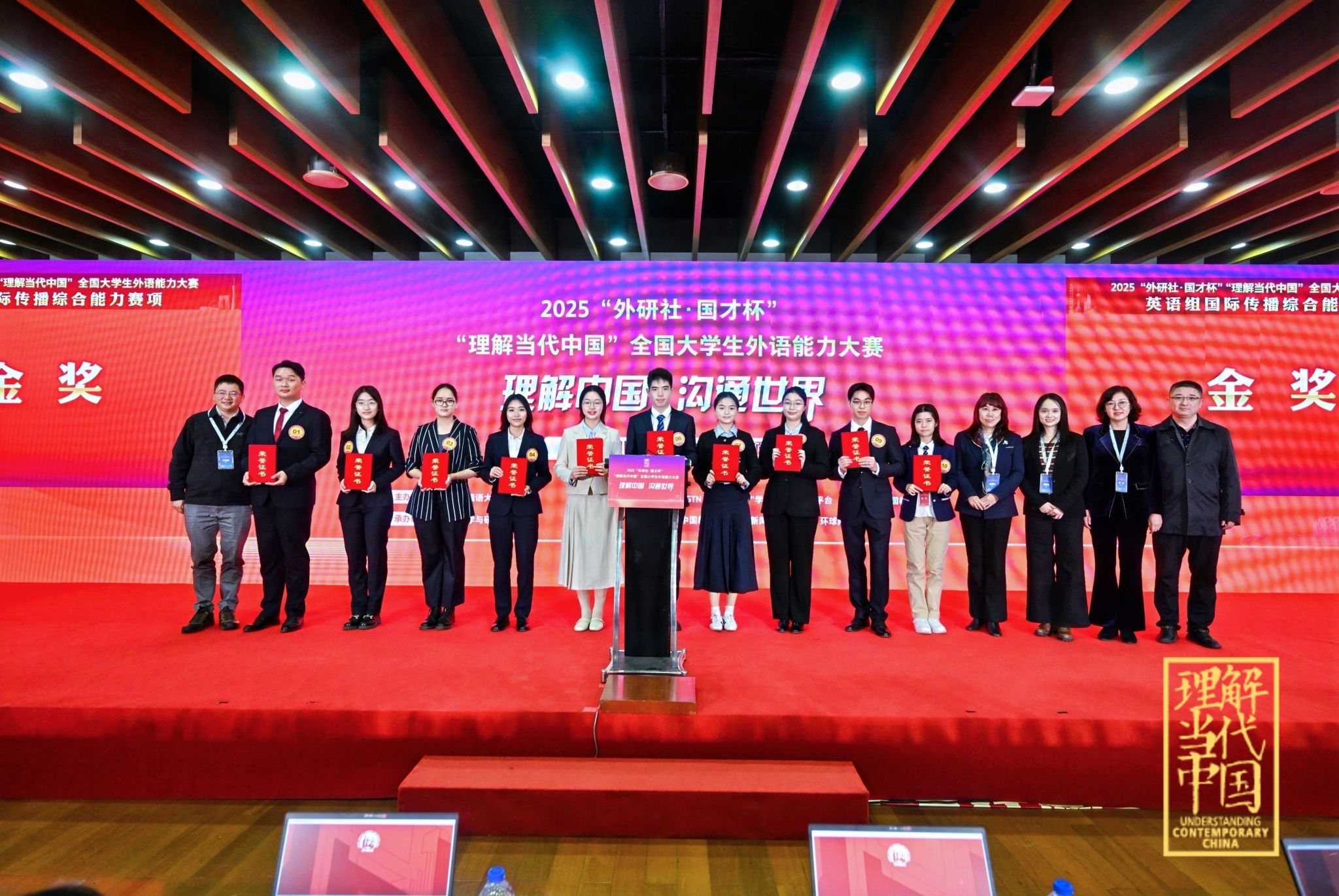 “外研社·国才杯”“理解当代中国” 全国大学生外语能力大赛英语组国际传播综合能力赛项国赛于11月22日启动,设计“阐释中国话语”“讲述中国故事”“贡献中国智慧”“提出中国方案”四个阶段。王浩天从1109名选手中层层脱颖而出,通过书面综合考查、定题演讲与即兴问答等各类考查,跻身全国60强,斩获全国金奖。指导教师为陈亦挺、诸葛文婵、李小燕。